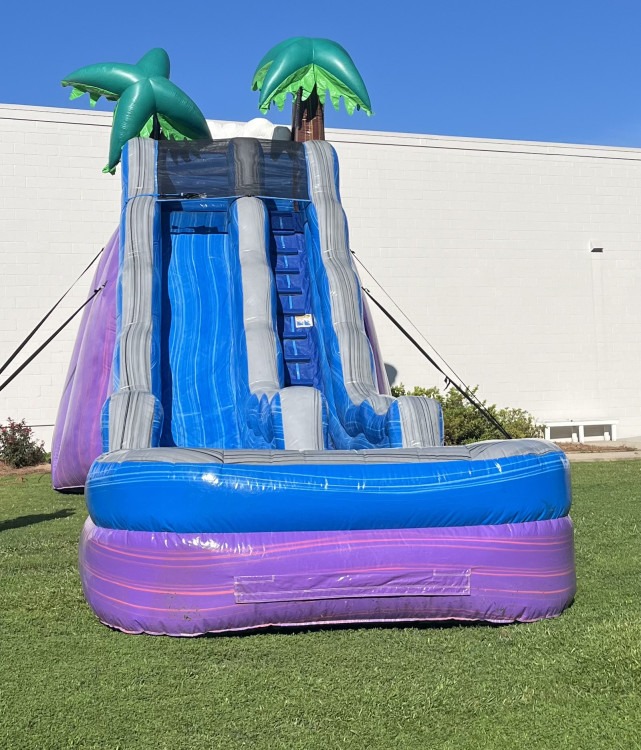 Experience the thrill of sliding down a 20-foot Tropical Paradise Slide, designed for both wet and dry fun. During hot summer days, hook up the water for a splash-tastic ride, or keep it dry for a super fast, action-packed descent. Ideal for all ages. *Image is shown with the pool. If rented dry, pool is removed.